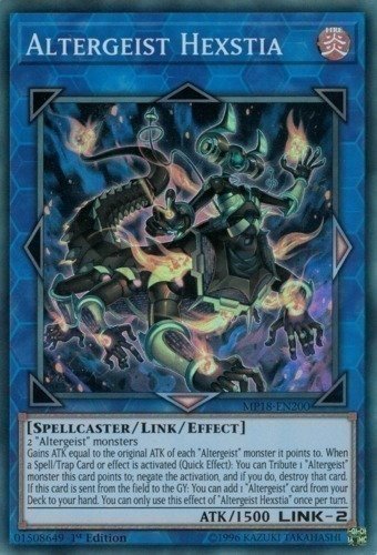 Gains ATK equal to the original ATK of each “Altergeist” monster it points to. When a Spell/Trap Card or effect is activated (Quick Effect): You can Tribute 1 “Altergeist” monster this card points to; negate the activation, and if you do, destroy that card. If this card is sent from the field to the GY: You can add 1 “Altergeist” card from your Deck to your hand. You can only use this effect of “Altergeist Hexstia” once per turn.