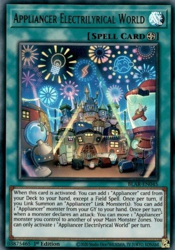 When this card is activated: You can add 1 “Appliancer” card from your Deck to your hand, except a Field Spell. Once per turn, if you Link Summon an “Appliancer” Link Monster(s): You can add 1 “Appliancer” monster from your GY to your hand. Once per turn, when a monster declares an attack: You can move 1 “Appliancer” monster you control to another of your Main Monster Zones. You can only activate 1 “Appliancer Electrilyrical World” per turn.