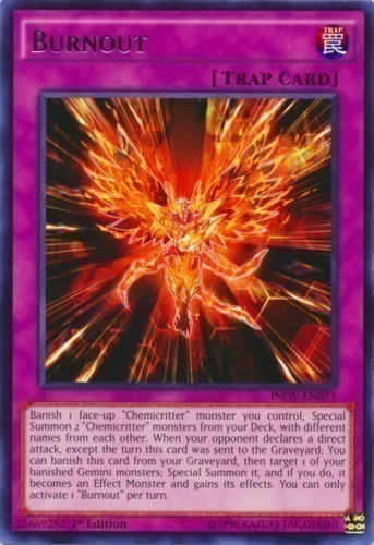 Banish 1 face-up “Chemicritter” monster you control; Special Summon 2 “Chemicritter” monsters from your Deck, with different names from each other. When your opponent declares a direct attack, except the turn this card was sent to the Graveyard: You can banish this card from your Graveyard, then target 1 of your banished Gemini monsters; Special Summon it, and if you do, it becomes an Effect Monster and gains its effects. You can only activate 1 “Burnout” per turn.