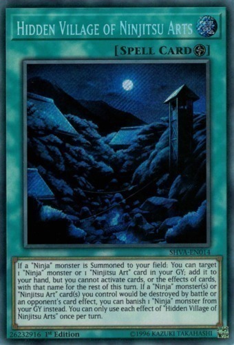 If a “Ninja” monster is Summoned to your field: You can target 1 “Ninja” monster or 1 “Ninjitsu Art” card in your GY; add it to your hand, but you cannot activate cards, or the effects of cards, with that name for the rest of this turn. If a “Ninja” monster(s) or “Ninjitsu Art” card(s) you control would be destroyed by battle or an opponent’s card effect, you can banish 1 “Ninja” monster from your GY instead. You can only use each effect of “Hidden Village of Ninjitsu Arts” once per turn.