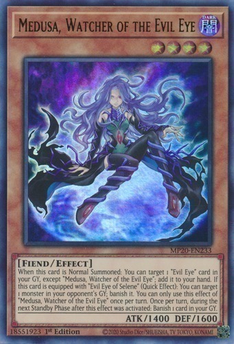 When this card is Normal Summoned: You can target 1 “Evil Eye” card in your GY, except “Medusa, Watcher of the Evil Eye”; add it to your hand. If this card is equipped with “Evil Eye of Selene” (Quick Effect): You can target 1 monster in your opponent’s GY; banish it. You can only use this effect of “Medusa, Watcher of the Evil Eye” once per turn. Once per turn, during the next Standby Phase after this effect was activated: Banish 1 card in your GY.