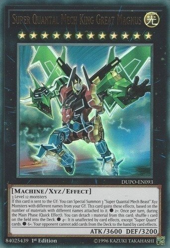 If this card is sent to the GY: You can Special Summon 3 “Super Quantal Mech Beast” Xyz Monsters with different names from your GY. This card gains these effects, based on the number of materials with different names attached to it. ● 2+: Once per turn, during the Main Phase (Quick Effect): You can detach 1 material from this card; shuffle 1 card on the field into the Deck. ● 4+: It is unaffected by card effects, except “Super Quant” cards. ● 6+: Your opponent cannot add cards from the Deck to the hand by card effects.