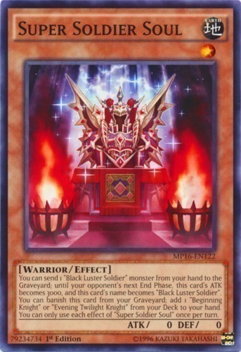 You can send 1 “Black Luster Soldier” monster from your hand to the Graveyard; until your opponent’s next End Phase, this card’s ATK becomes 3000, and this card’s name becomes “Black Luster Soldier”. You can banish this card from your Graveyard; add 1 “Beginning Knight” or “Evening Twilight Knight” from your Deck to your hand. You can only use each effect of “Super Soldier Soul” once per turn.