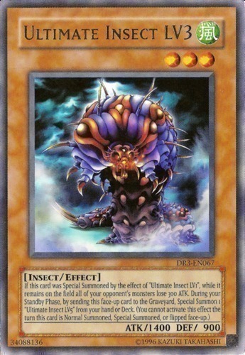 If this card was Special Summoned by the effect of “Ultimate Insect LV1”, while it remains on the field all of your opponent’s monsters lose 300 ATK. During your Standby Phase, by sending this face-up card to the Graveyard, Special Summon 1 “Ultimate Insect LV5” from your hand or Deck. (You cannot activate this effect the turn this card is Normal Summoned, Special Summoned, or flipped face-up.)