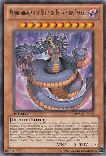Cannot be Normal Summoned/Set. Must be Special Summoned with “Rise of the Snake Deity” or by its own effect. Gains 500 ATK for each Reptile monster in your GY. Neither player can target this card with card effects, also it is unaffected by other cards and their effects. When this card is destroyed by battle and sent to the GY: You can banish 1 other Reptile monster from your GY; Special Summon this card. When this card inflicts battle damage to your opponent: Place 1 Hyper-Venom Counter on it. When the 3rd Hyper-Venom Counter is placed on this card, you win the Duel.