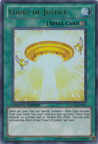 During your Main Phase: You can Special Summon 1 Fairy monster from your hand. You must control a Level 1 Fairy monster to activate and to resolve this effect. You can only use this effect of “Court of Justice” once per turn.